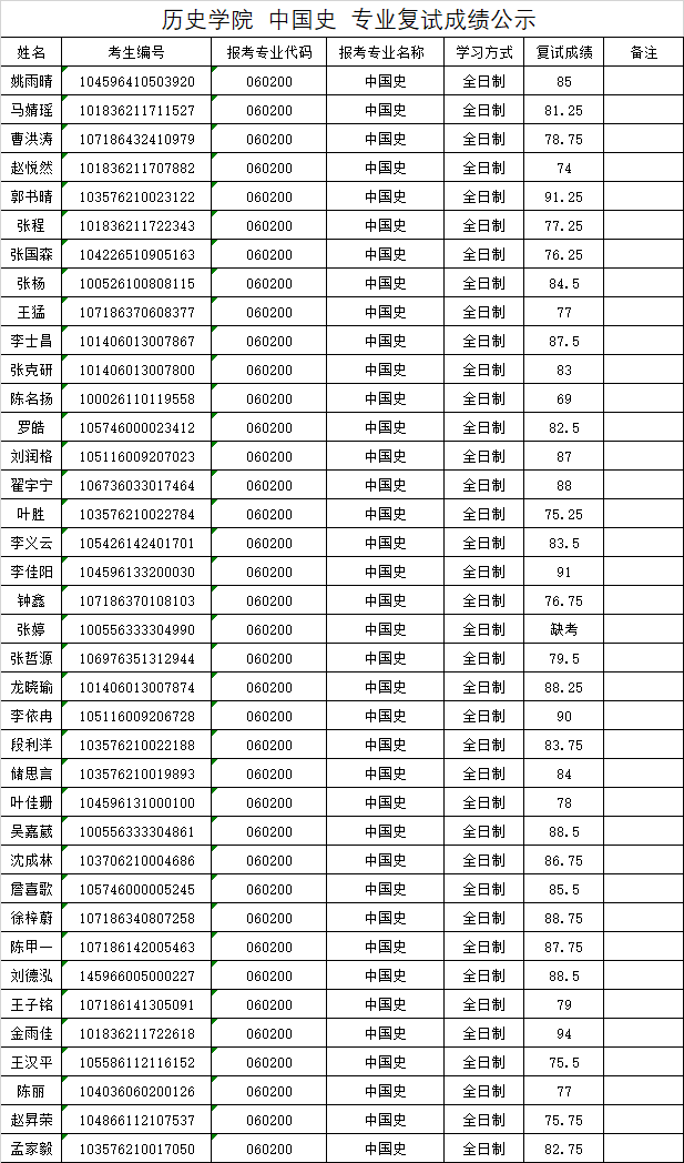 根据教育部办公厅《关于做好2026年全国硕士研究生复试工作的通知》精神和教育部、河北省教育考试院2026年全国硕士研究生复试工作会议精神,结合《河北大学2026年硕士研究生复试调剂录取办法》,在确保安全性、公平性和科学性的基础上,我院中国史专业调剂研究生于2026年4月9日组织了复试工作。现对此专业复试成绩予以公布: