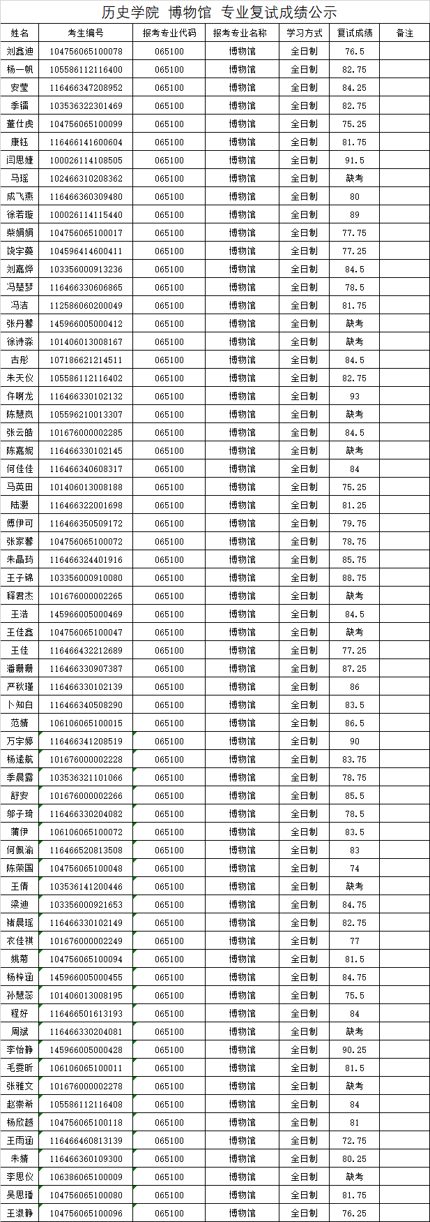 根据教育部办公厅《关于做好2026年全国硕士研究生复试工作的通知》精神和教育部、河北省教育考试院2026年全国硕士研究生复试工作会议精神,结合《河北大学2026年硕士研究生复试调剂录取办法》,在确保安全性、公平性和科学性的基础上,我院博物馆专业调剂研究生于2026年4月9-10日组织了复试工作。现对此专业复试成绩予以公布: