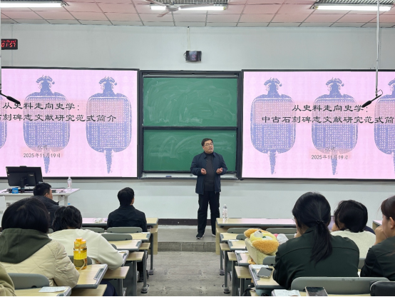 “师生幸会,开卷有益。共读同想,得乐生趣”。2025年11月19日晚,我院史学新生开卷会第九期暨优秀毕业生返校交流活动,在五四路校区第九教学楼206教室举办。本次开卷会的主题为“从史料走向史学:中古石刻碑志文献研究范式简介”,邀请我院优秀毕业生、陕西师范大学历史文化学院张明老师担任主讲嘉宾,带领大家一起去领略中古时期石刻碑志研究的魅力。历史学院副院长郭晓勇、中国史系系主任张旭出席,学院本科生、研究生近130人参加了活动。
